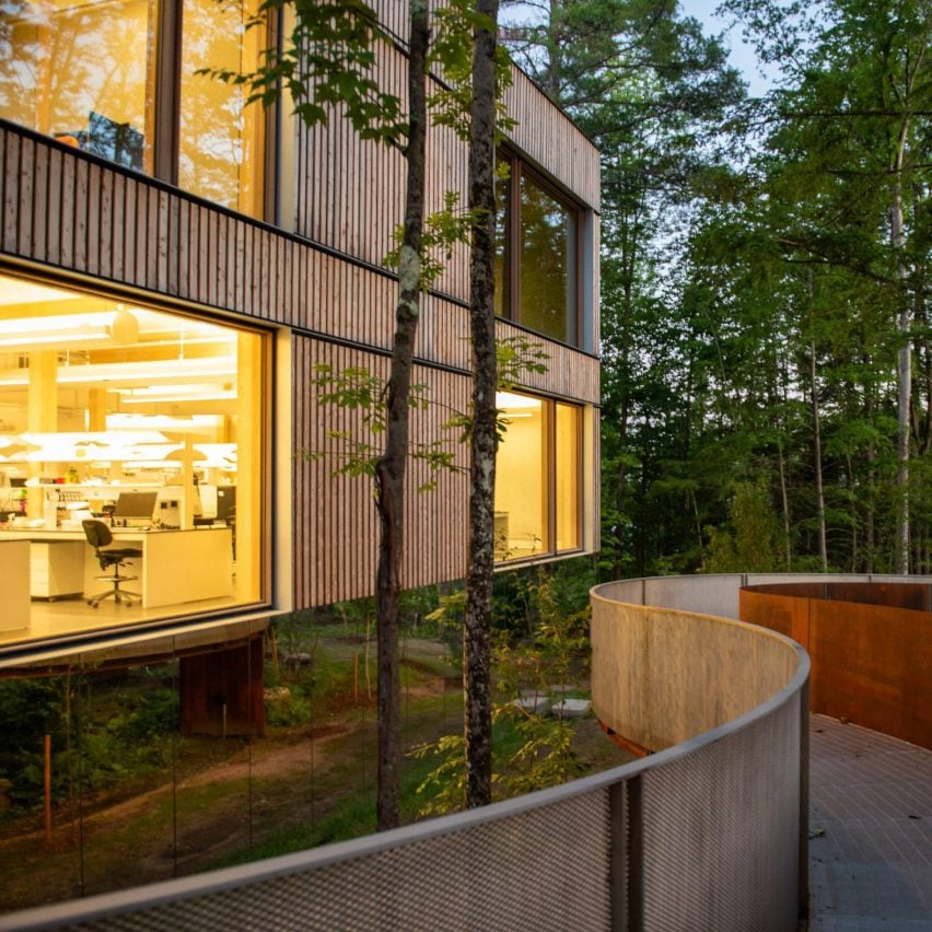 This post was originally published on this site Wood is paired with mirrored panels on the exterior of a research building for biotech company Adimab,…
